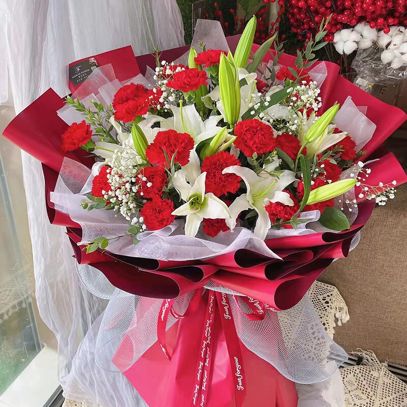 【永恒记忆】19支红色康乃馨,3支多头香水百合,搭配黄莺、勿忘我装饰。