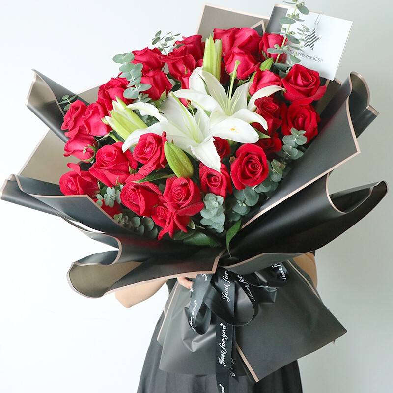 【北岛初晴】33朵红玫瑰,1支白色多头香水百合,搭配尤加利叶装饰。