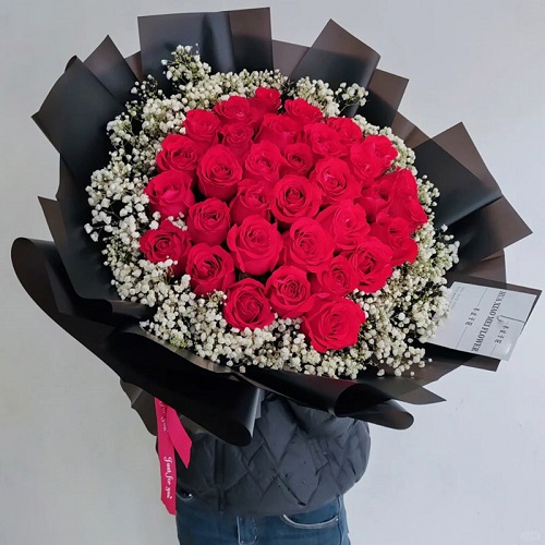 【纯美爱人】33朵红玫瑰,满天星环绕。