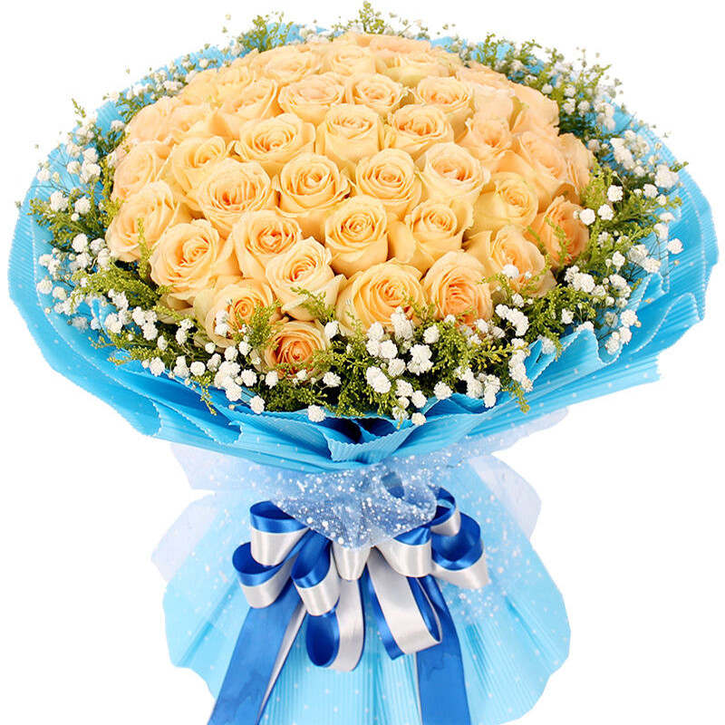 【爱的纪念】66支顶级香槟玫瑰,黄莺、满天星围绕。