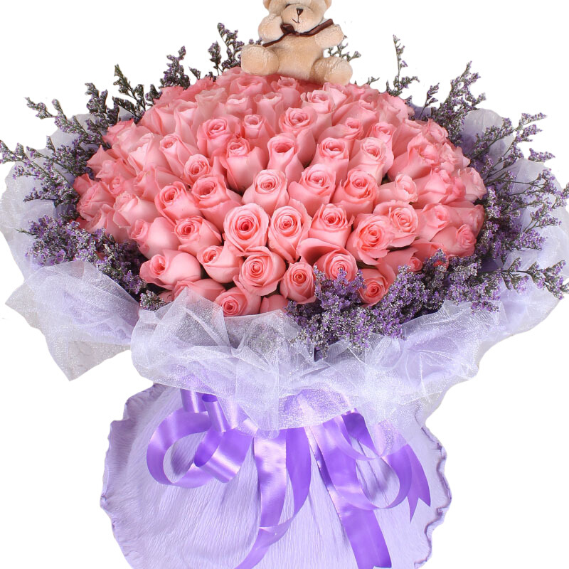【心动】66朵精品粉玫瑰,1只小熊,水晶草外围。