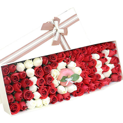 【遇见最美的你】75朵混色玫瑰(白玫瑰、红玫瑰拼字IOU)、1颗红苹果。