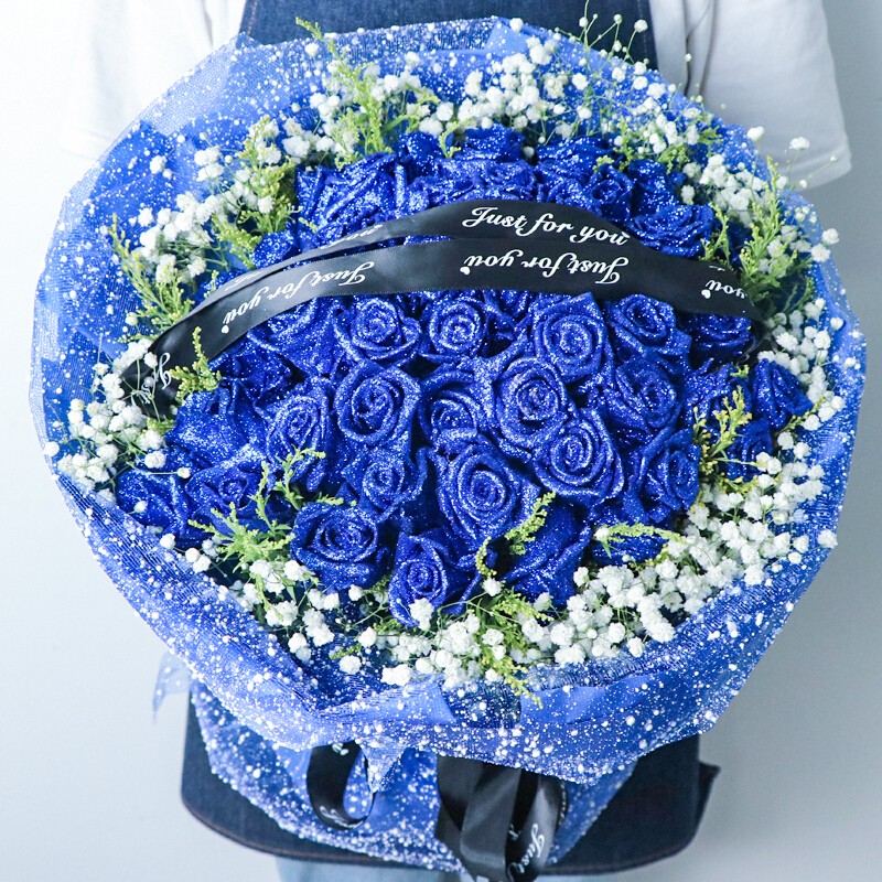 【珍惜的爱】52朵蓝色妖姬,搭配黄莺满天星外围环绕,花面礼品缎带装饰。
