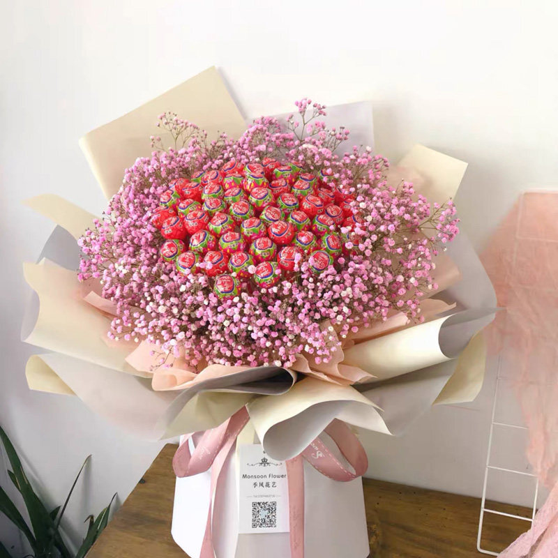 【简单浪漫】52颗棒棒糖,搭配粉色满天星装饰。