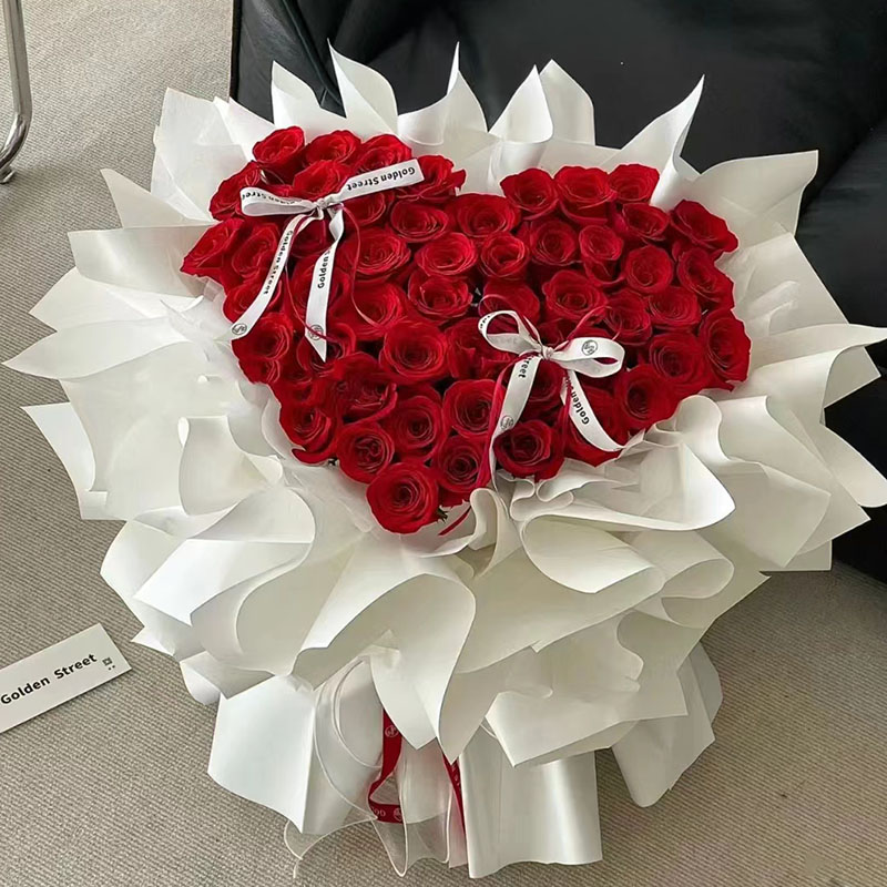 【幸福童话】52朵红玫瑰心形造型,花面2条缎带蝴蝶结装饰。