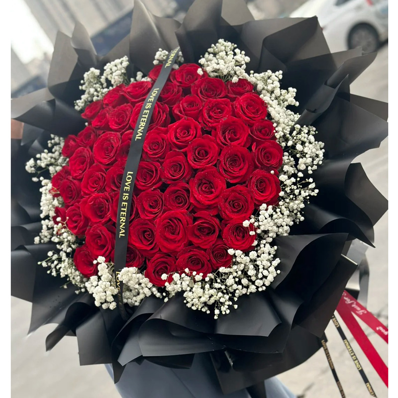 【只想爱你】52朵精品红玫瑰,外围搭配满天星黄莺装饰。