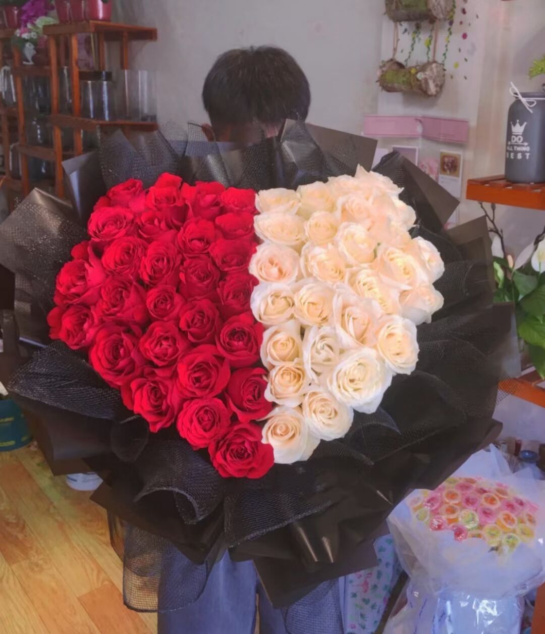 【一半清晨一半是你】52朵精品玫瑰,左边26朵红玫瑰,右边26朵香槟玫瑰,心形形状造型。