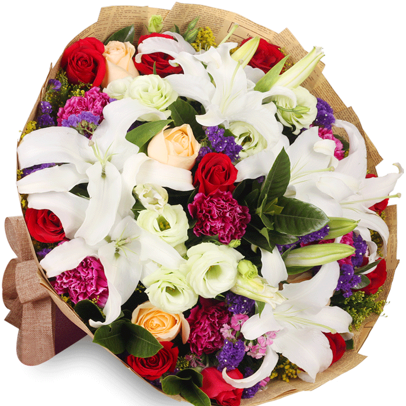 【群星闪耀】16支玫瑰(混色),6朵康乃馨,4支白色多头香水百合,搭配桔梗、栀子叶、勿忘我装饰。