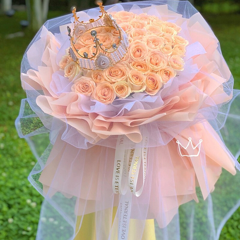 【与君初相识】精选52朵香槟玫瑰,皇冠置于花面装饰。