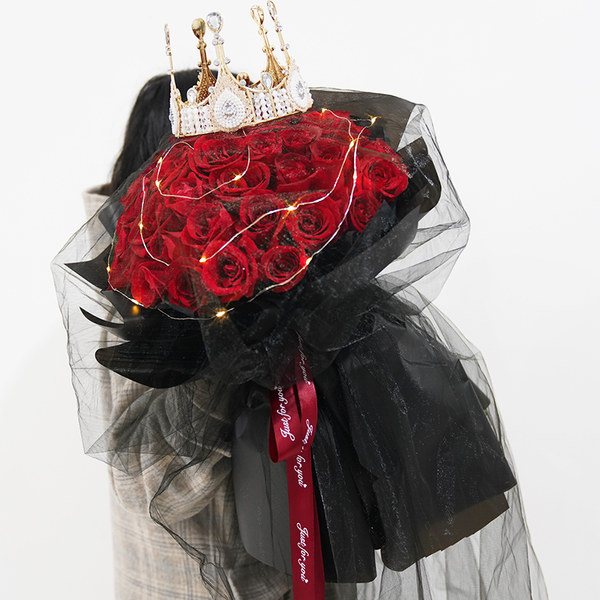 【一生陪你】99支精品红玫瑰,1条灯带,1个皇冠(样式随机),黑色英文缎带装饰花面。