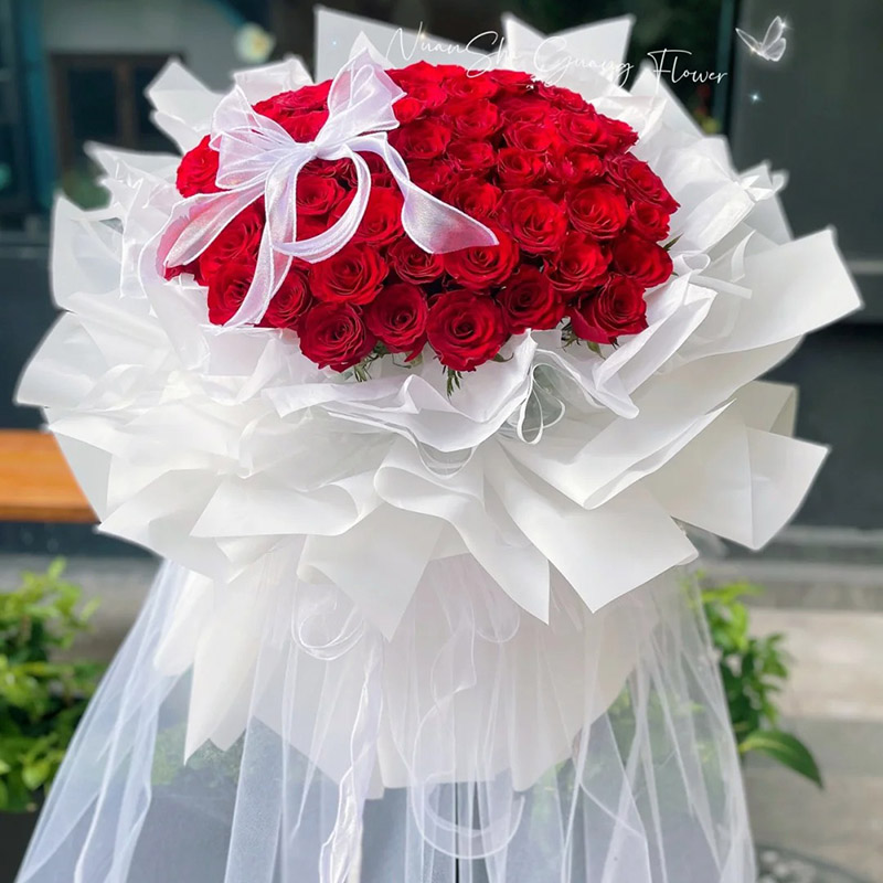 【十里红妆】99朵红玫瑰,白色缎带系蝴蝶结装饰花面。