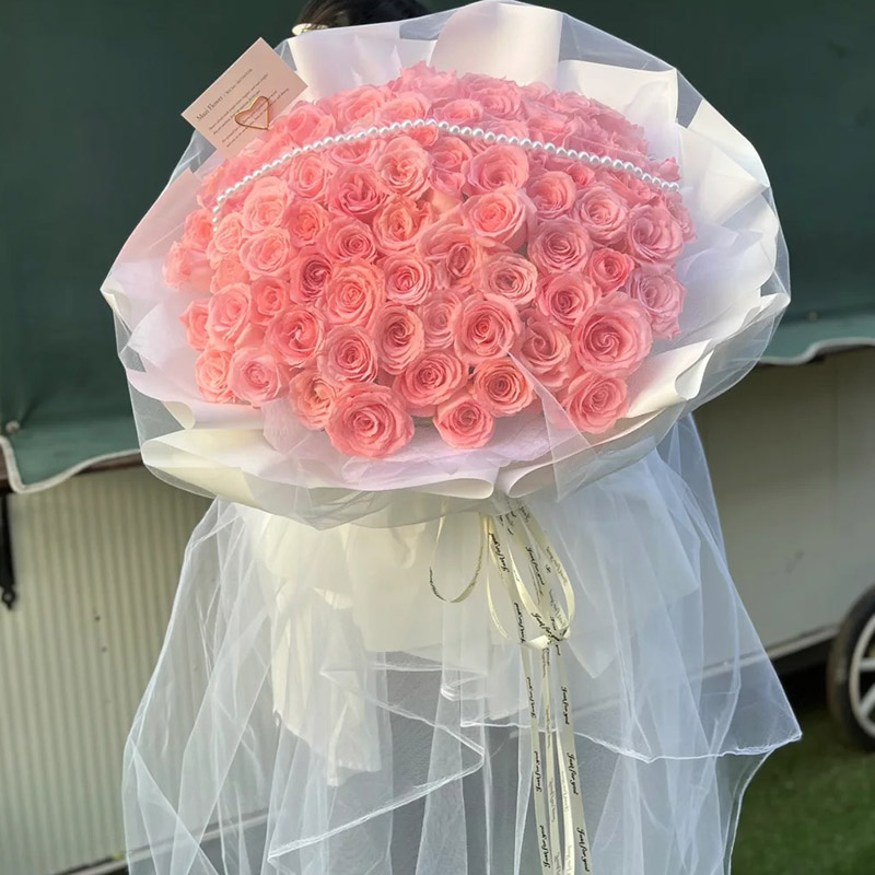 【我们的记忆】99朵精品粉玫瑰,1条珠串装饰花面。