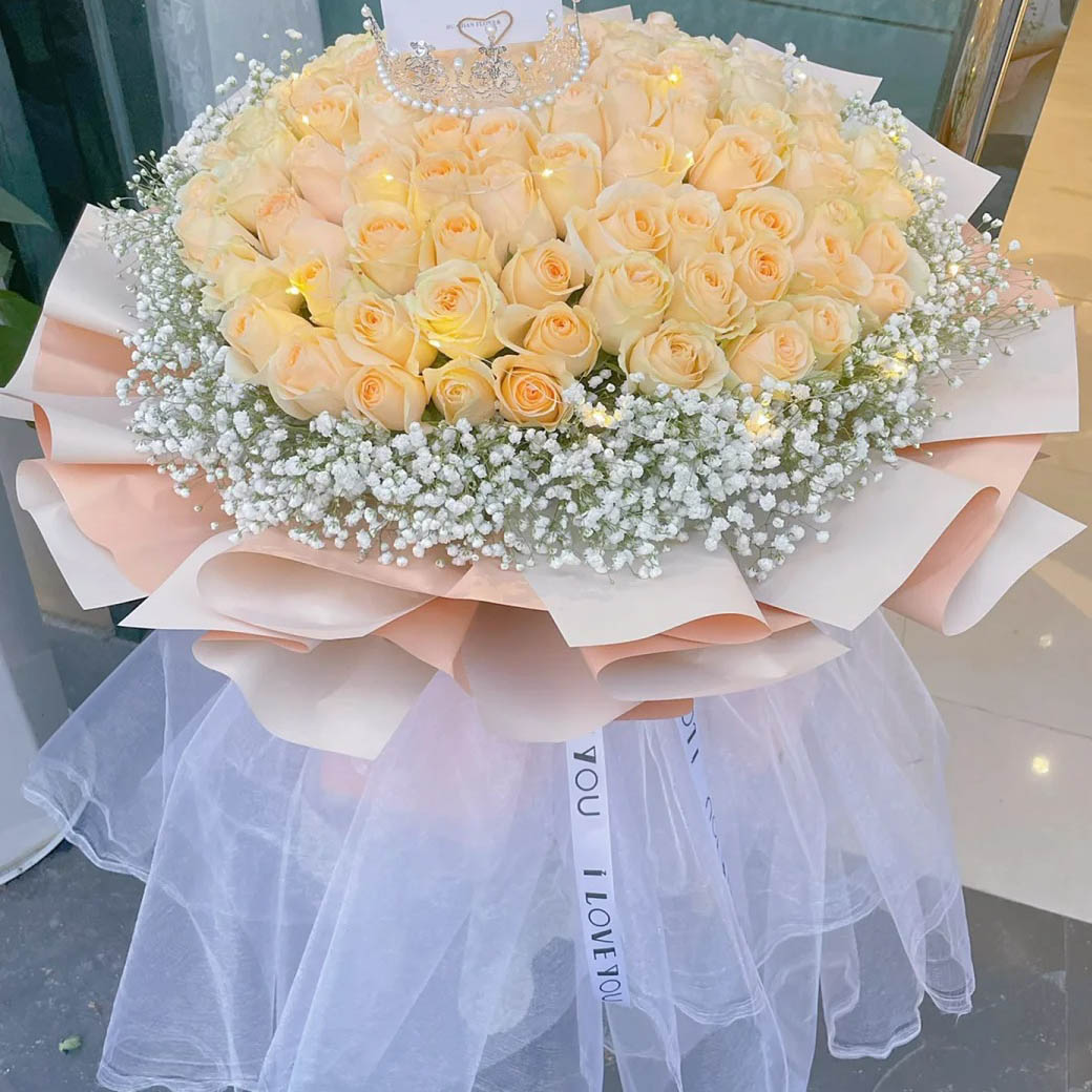 【阳光明媚】精选99朵香槟玫瑰花,1顶皇冠皇冠,满天星环绕装饰。