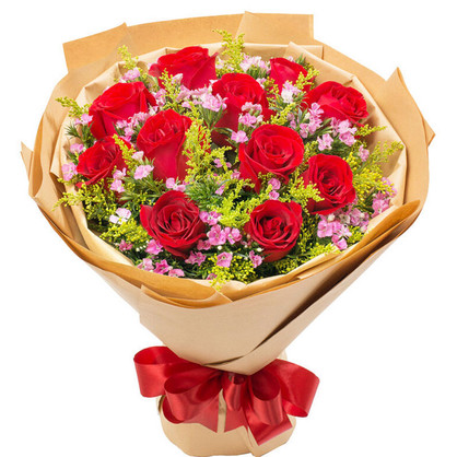 【浪漫时光】11枝红玫瑰,搭配满天星、栀子叶。