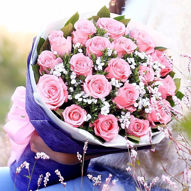 【爱如阳光】6朵戴安娜粉玫瑰,5朵香槟玫瑰(或白玫瑰),共11朵,搭配大量粉色满天星装饰。