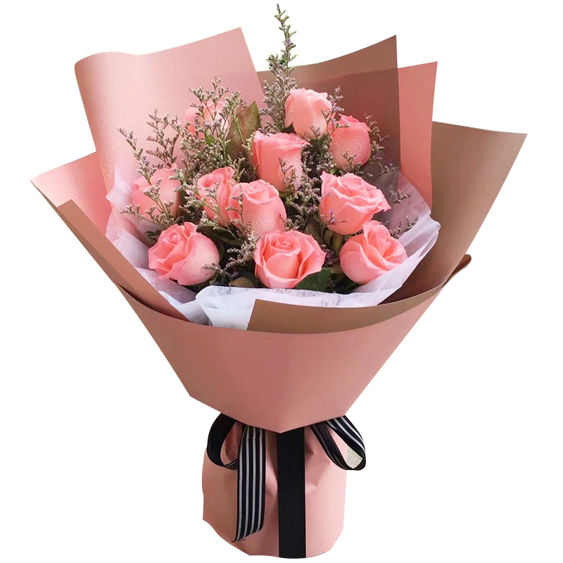 【温馨相伴】11支精品粉玫瑰,搭配适量情人草装饰。