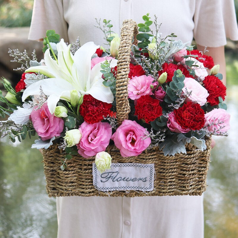 【温柔的爱】11朵红色康乃馨,10支粉桔梗(断货则用10朵粉玫瑰代替),1支白色香水百合,搭配洋桔梗、尤加利叶、情人草、银叶菊装饰。