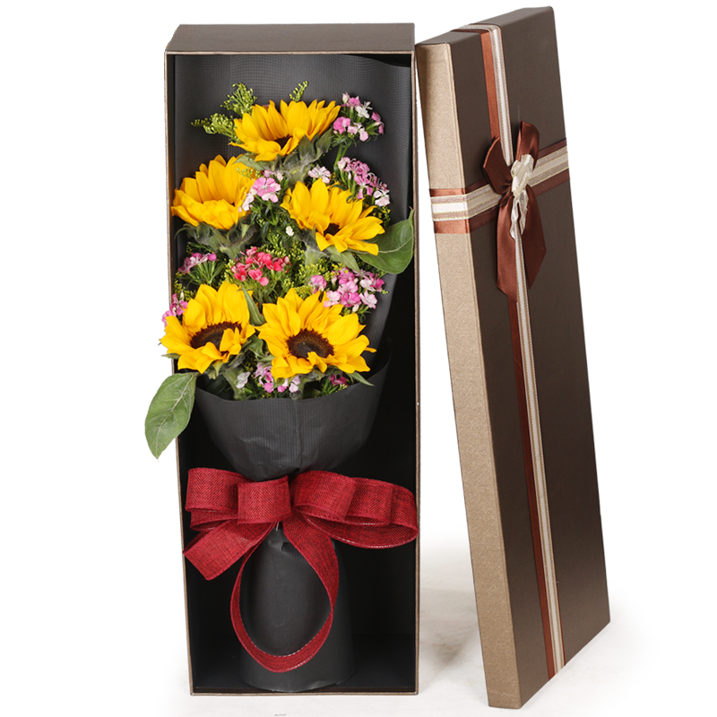 【微笑向前】5支向日葵,搭配黄莺、绿叶、石竹梅点缀。