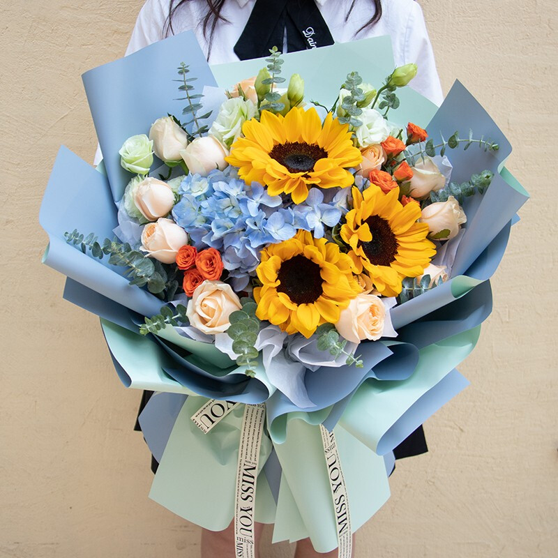【夏日花园】9支精品紫玫瑰、1支蓝色绣球、3支向日葵、4支多头紫色洋桔梗、2支香槟色洋桔梗,搭配蓝色满天星、绿色小雏菊、尤加利叶,一朵蝴蝶结装饰花面。