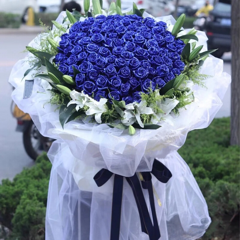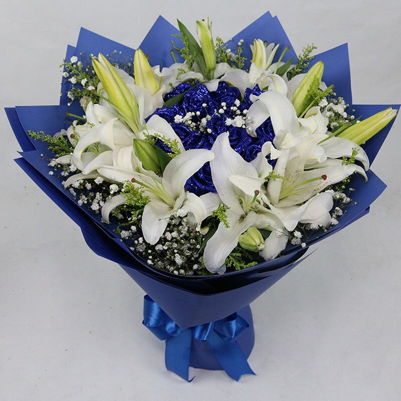 【思念的季节】11支蓝玫瑰,21朵白色香水百合外围环绕,满天星装饰。