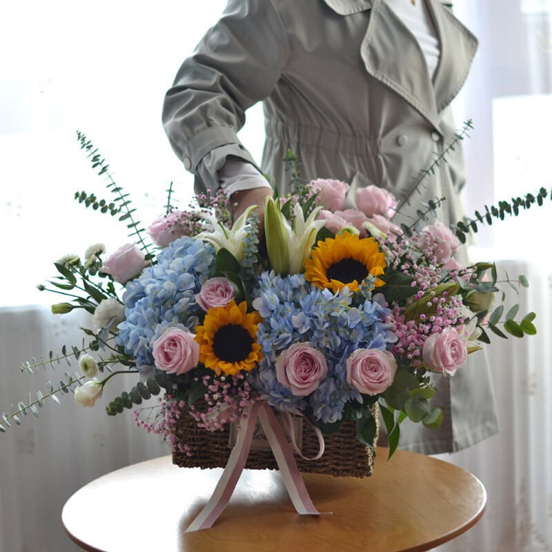 【清酒桃花】精选2支蓝色绣球花,2支向日葵,16朵粉玫瑰,1支白色多头百合,搭配洋桔梗,粉色满天星,尤加利叶装饰,粉色蝴蝶结。