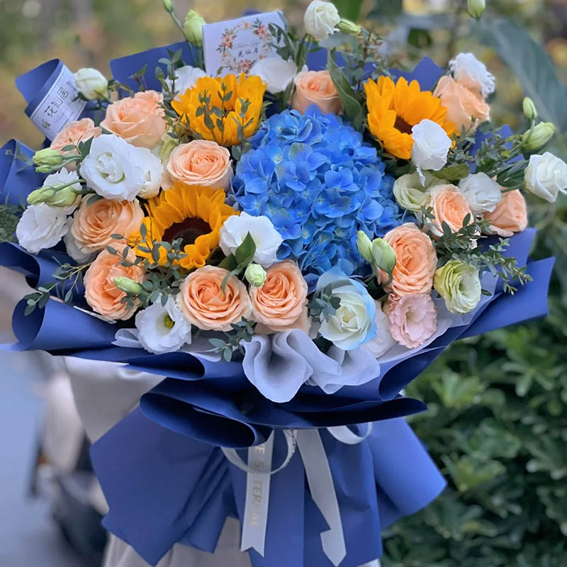 【风和日丽】16朵香槟玫瑰,5朵向日葵,1支蓝色绣球花,搭配小雏菊,银叶菊,尤加利叶装饰。