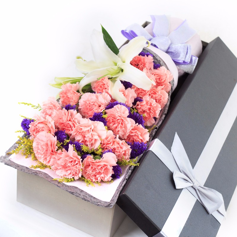【思念绵绵】19支粉色康乃馨,1支白色多头百合,搭配适量黄莺、紫色勿忘我。
