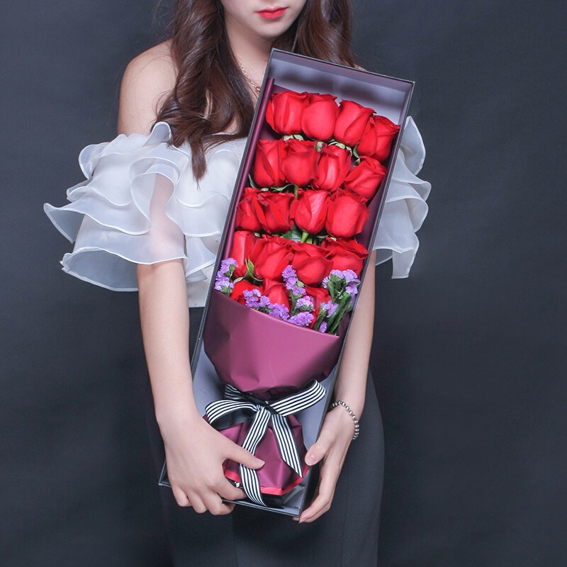 【听心】19朵红玫瑰,搭配勿忘我装饰。