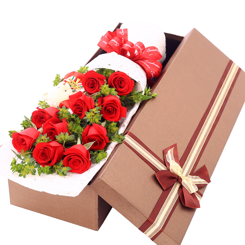 【恒久诺言】11朵红玫瑰,1条灯带,搭配满天星丰满包扎。