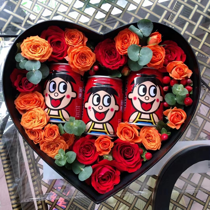 【幸运旺旺】3罐旺仔牛奶,8朵红玫瑰,8支多头橙色小玫瑰,搭配尤加利叶、红豆装饰。