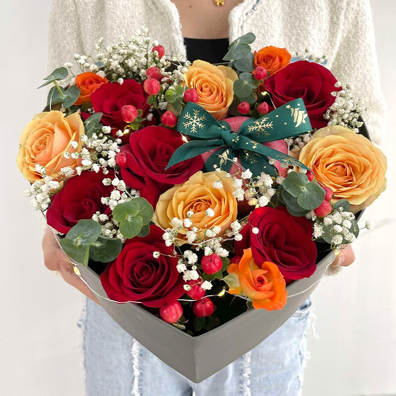 【祝福陪伴】1个苹果,10朵混搭玫瑰(红玫瑰、香槟玫瑰),1个灯串,搭配3支多头小玫瑰,白色满天星,红豆,苹果表面用墨绿色缎带蝴蝶结装饰。