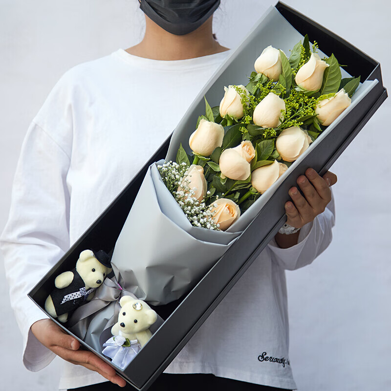 【三月天】11朵香槟玫瑰,2只可爱小公仔,黄莺草,栀子叶,满天星间插丰满。