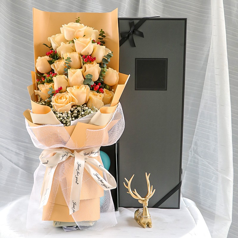 【相思难忘】19朵香槟玫瑰,搭配满天星、红豆装饰。