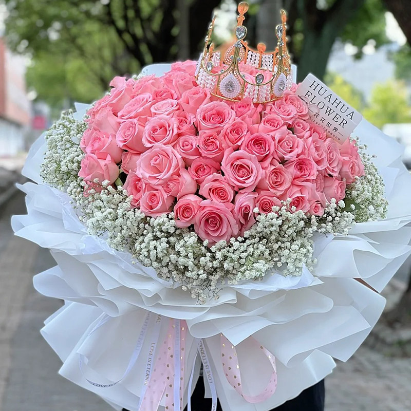 【暖阳浅笑】99朵粉玫瑰,1顶皇冠(款式随机)、搭配白色满天星环绕。