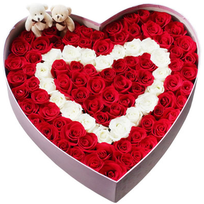 【火红的爱恋】99支精品混色玫瑰(红玫瑰、白玫瑰)、2只可爱小熊。