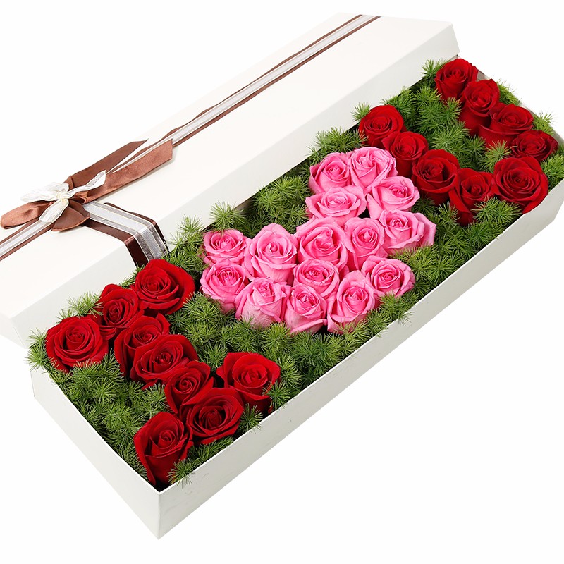 【520-我爱你】520拼字(11支精品红玫瑰+11支精品白玫瑰+12支精品粉玫瑰),搭配天冬门打底(若天冬门断货则用其他同效果配草替换)。