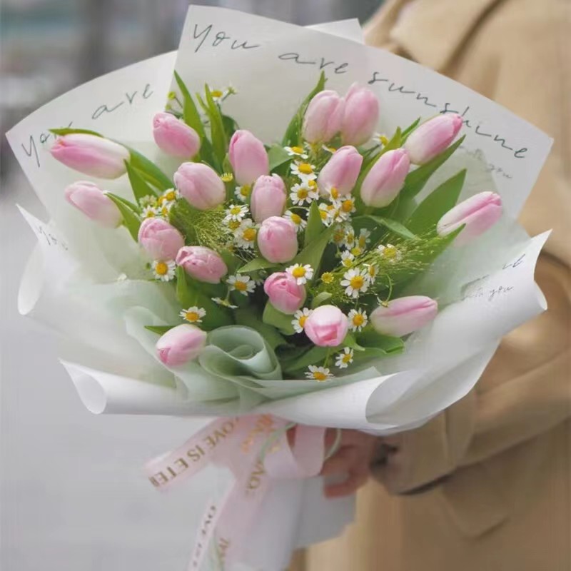 【光阴念安】精选19朵粉色郁金香,搭配小雏菊等配花装饰。(郁金香为季节性花材,花期为3-5月,需提前订购)