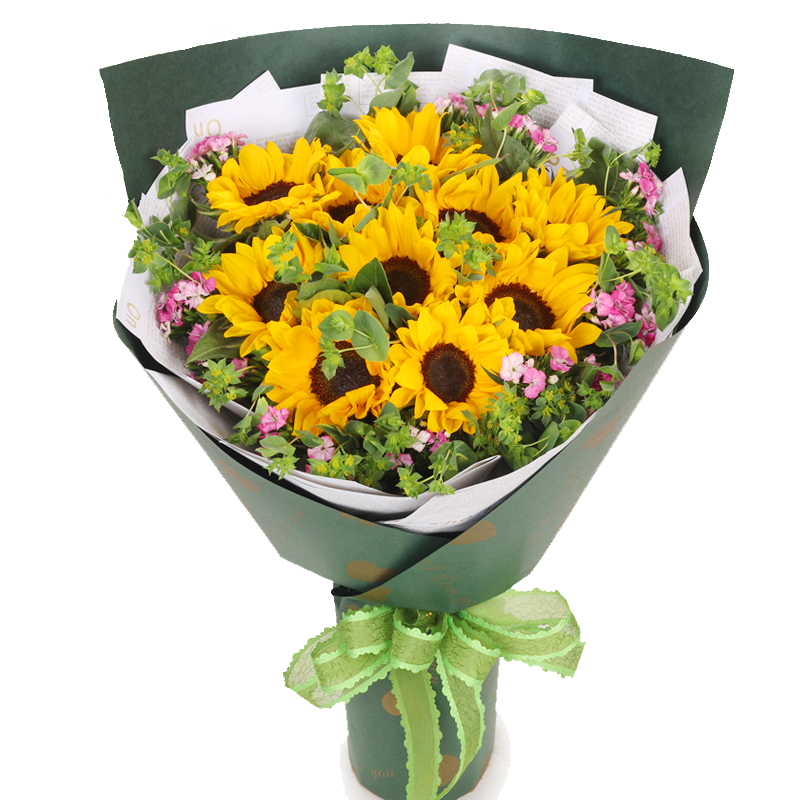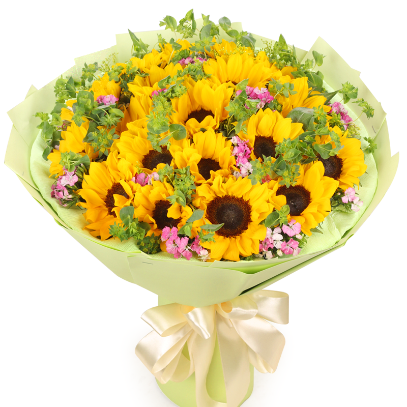 【最大的祝福】11朵精品向日葵,搭配叶上黄金、绿叶、石竹梅点缀。