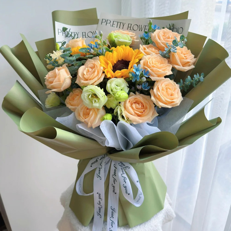 【阳光灿烂】2支向日葵,11朵香槟玫瑰,搭配4支洋桔梗,尤加利叶装饰。