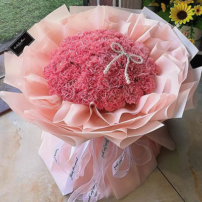 【恒久的温暖】33支粉色康乃馨,搭配1条珠串蝴蝶结装饰。