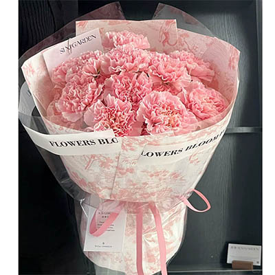 【暖暖亲情】11支精品粉康乃馨、1支多头白百合,搭配黄莺装饰。