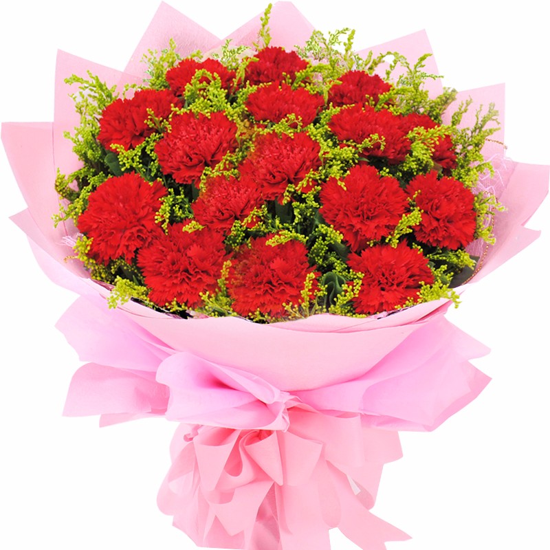 【深深母爱】19支红色康乃馨,搭配适量黄莺。