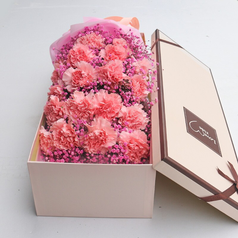 【美妙心情】精选19朵粉色康乃馨,搭配粉色满天星装饰。
