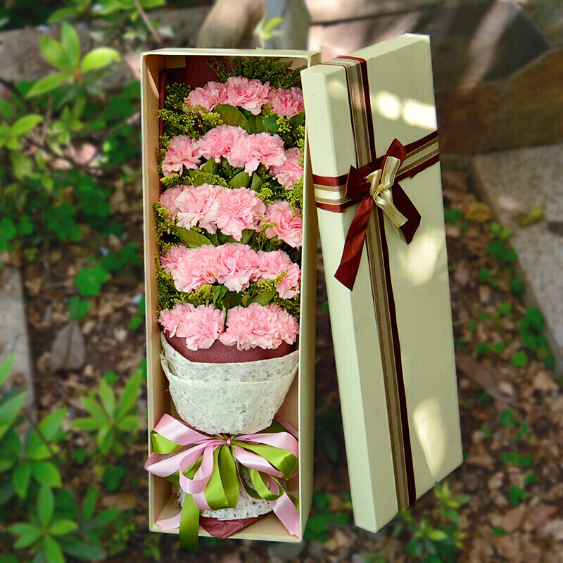 【花开序言】19朵精品粉色康乃馨,搭配黄莺草、栀子叶装饰。