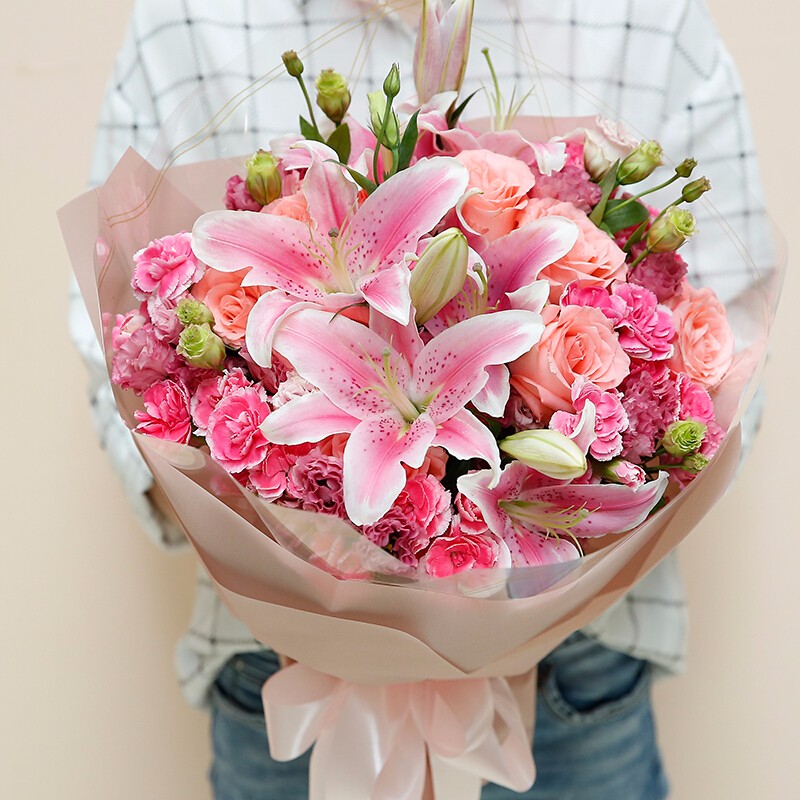 【柔光】精选4支粉色康乃馨、粉玫瑰混搭,4支多头洋桔梗,4支粉色折射玫瑰,搭配尤加利叶装饰。