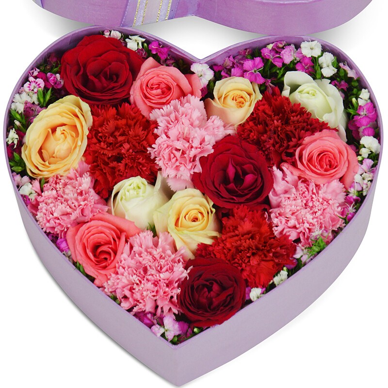 【彩虹心情】19朵玫瑰、康乃馨混搭(红玫瑰3朵,粉玫瑰3朵,香槟玫瑰3朵,白玫瑰3朵,红色康乃馨3朵,粉色康乃馨4朵),搭配石竹梅、满天星装饰。