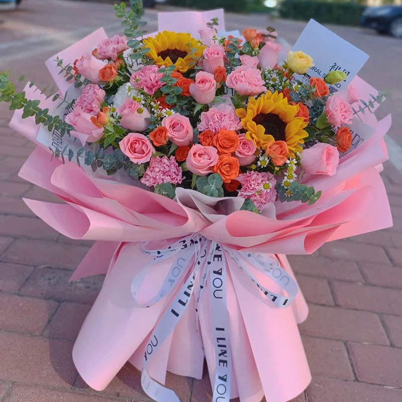 【情真意切】2朵向日葵,19朵粉玫瑰与粉色康乃馨混搭,9支多头橙色小玫瑰(断货则用同数量洋桔梗代替),尤加利叶、洋甘菊装饰。