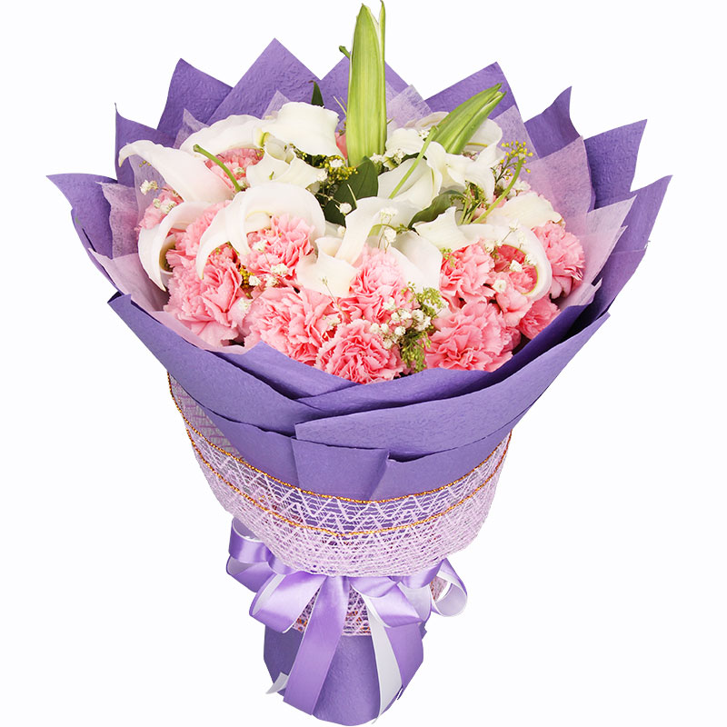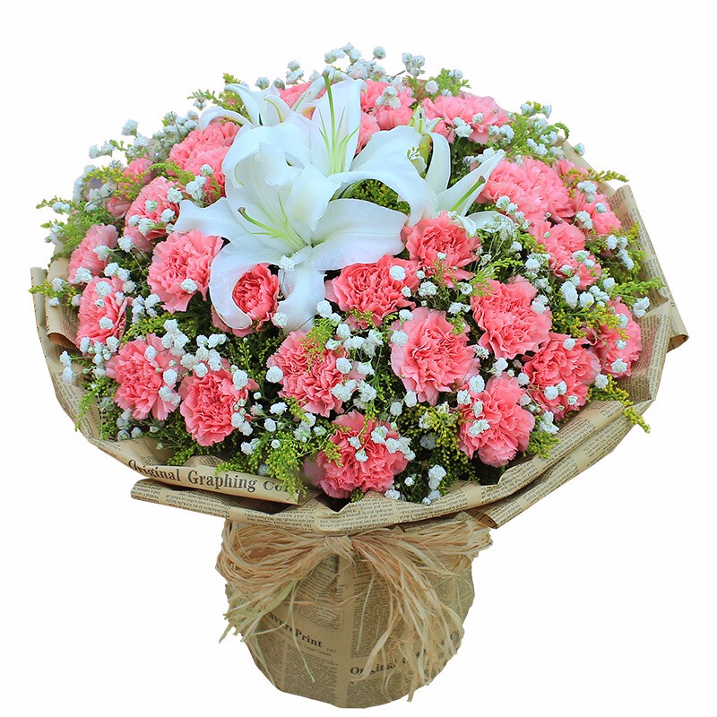 【祝福你】19支粉色康乃馨,3支白色多头香水百合,搭配满天星装饰。