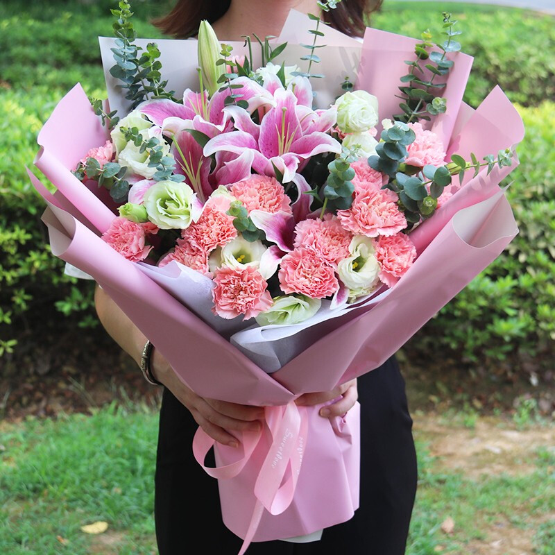 【幸福领悟】19朵粉色康乃馨,2支粉色多头百合,搭配4支洋桔梗、尤加利叶装饰。