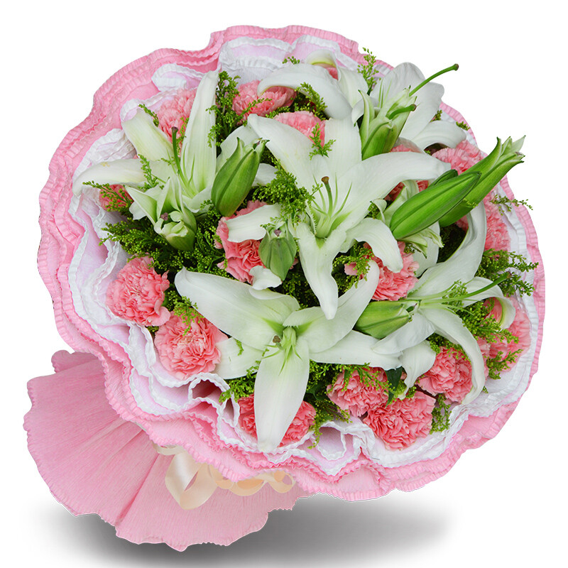 【一世芳华】16朵精品粉色康乃馨,3支多头白色香水百合,搭配黄莺草间插。